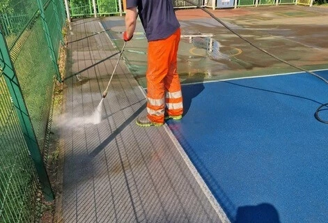 Identify the surface type - We confirm if it is tarmac, wetpour rubber, synthetic grass or resin bound gravel. This guides the method because each surface needs specific pressures, tools and treatments.